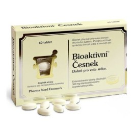 Bioaktivní Česnek, Pharma Nord Dennmark. 60 tablet (obsahuje 300 mg sušeného česnekového prášku (odpovídá 4,7 mg účinné látky) v tabletě, která má enterosolventní potah a která zajišťuje vysokou biologickou dostupnost.