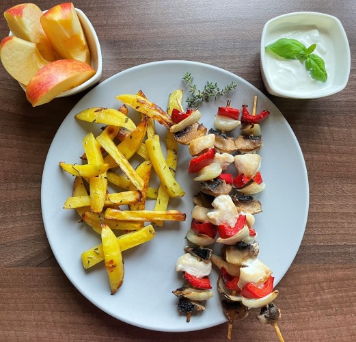 Kuřecí špíz s hranolky a česnekovým dipem sestavte si dietu v našem fotojídelníčku