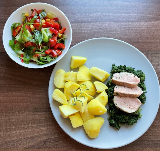 Vepřová panenka na špenátovém lůžku s bramborem a salátem sestavte si dietu v našem fotojídelníčku