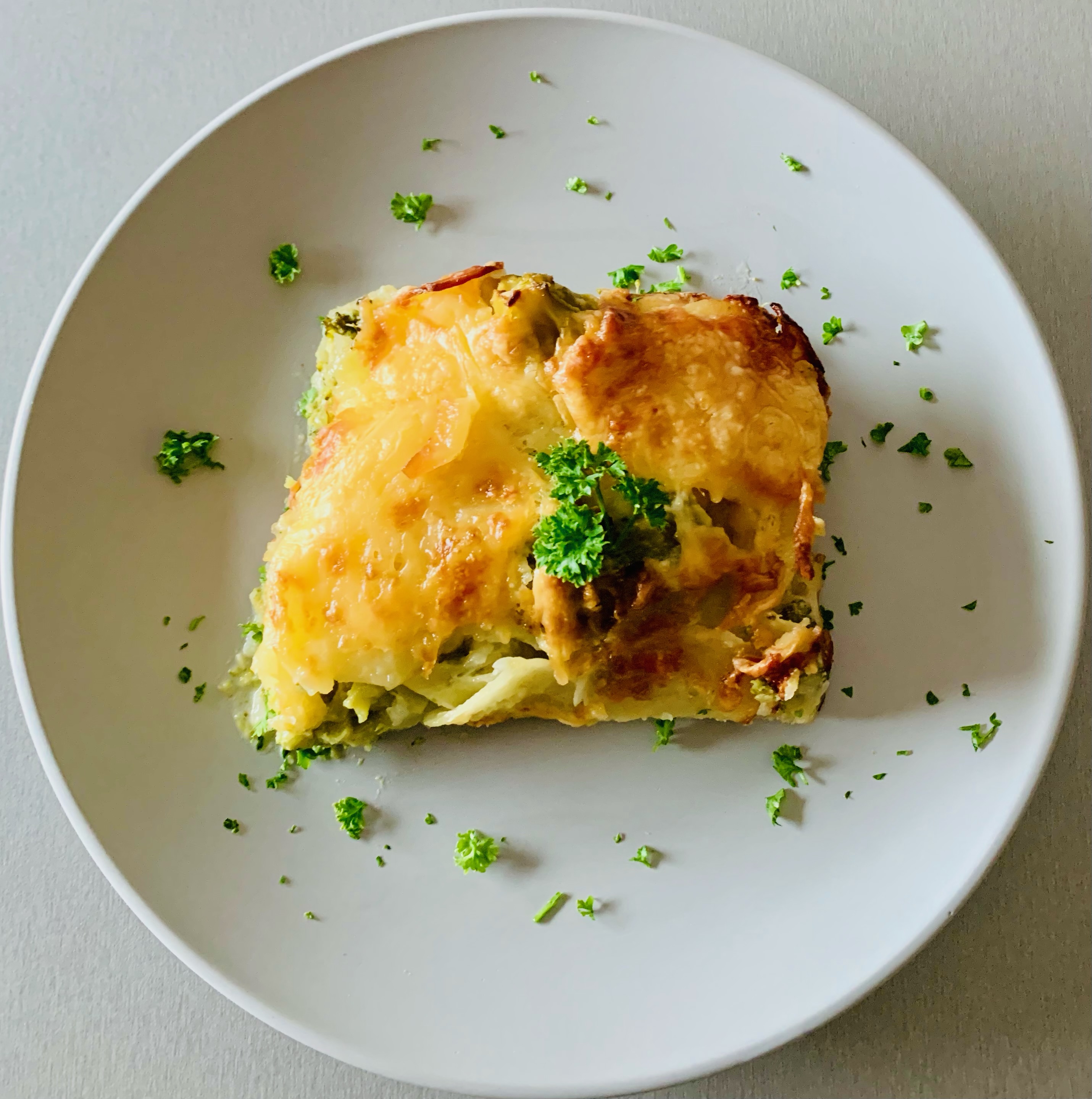 Brambory nakrájíme nebo nastrouháme na tenké plátky, brokolici rozebereme na malé růžičky. Společně povaříme 3 minuty v osolené vodě. Cibuli nakrájíme na plátky a rozebereme na kolečka. Pekáček vymažeme máslem, vrstvíme do něj brambory s brokolicí a cibuli. Okořeníme. Zalijeme smetanou s prolisovaným česnekem a posypeme nastrouhaným sýrem. Vložíme do trouby předehřáté na 180 °C a 35 minut pečeme.