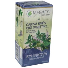 Čajová směs pro diabetiky, Megafyt (Borůvka černá Vaccinium myrtillus - list, Fazol obecný Phaseolus vulgaris - lusk, Jestřabina lékařská Galega officinalis - nať, Kopřiva dvoudomá Urtica dioica - list, Smetanka lékařská Taraxacum officinale - kořen, Šalvěj lékařská Salvia officinalis - list,)