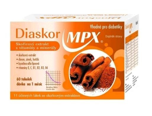 Diaskor MPX, Medaprex 60 cps. (Skořice Cinnamomum cassia extrakt 300 mg, Chrom - 25 mg, Hořčík – 38 mg, Zinek- 8 mg , Kyselina alfa-lipoová - 80 mg, vitamíny B1 (tiamin) - 3 mg, B2 (riboflavin) – 2 mg, B3 (niacin) – 7 mg, B6 (pyridoxin) – 2 mg, C – 150 mg, E – 20 mg v 1 kapsli)
