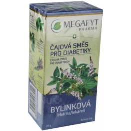 Čajová směs pro diabetiky, Megafyt (Borůvka černá Vaccinium myrtillus - list, Fazol obecný Phaseolus vulgaris - lusk, Jestřabina lékařská Galega officinalis - nať, Kopřiva dvoudomá Urtica dioica - list, Smetanka lékařská Taraxacum officinale - kořen, Šalvěj lékařská Salvia officinalis - list).