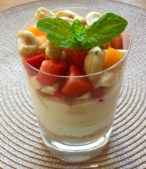 Ovesné vločky přes noc namočíme do trochy vody a přisypeme k nim skořici. Druhý den v misce smícháme jogurt s tvarohem a medem (díky sladkému ovoci není ani nutný). Do skleničky nebo misky dáme nejprve vrstvu ovesných vloček se skořicí, na ni směs jogurtu, tvarohu a medu. Navrch nakrájíme ovoce a to posypeme ořechy.