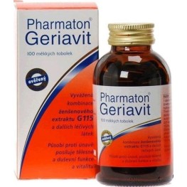 Pharmaton Geriavit, multivitamínový přípravek, Boehringer Ingelheim, 30, 100 tobolek, ženšen 40,0 mg, s obsahem ginsenosidů 1,6 mg, deanol 26,0 mg, vitamin A (retinol) 1,2 mg (4000 IU), vitamin D2 (ergocalciferol) 0,01 mg (400 IU), vitamin E (tocoferol) 10,0 mg, vitamin B1 (thiamin), 2,0 mg, vitamin B2 (riboflavin) 2,0 mg, vitamin B6 (pyridoxini) 1,0 mg, vitamin B12 (cyanocobalamin) 0,001 mg, calcii pantothenas 10,0 mg, vitamin B3 (nicotinamidum) 15,0 mg, vitamin C (acidum ascorbicum) 60,0 mg, rutosid 20,0 mg, fluorid 0,2 mg, kalium 8,0 mg, měď 1,0 mg, mangan 1,0 mg, magnesium 10,0 mg, železo 10,0 mg, zinek 1,0 mg, vápník 90,3 mg, fosfor 70,0 mg, lecitin 50,0 mg, sojový lecitin 16,0 mg